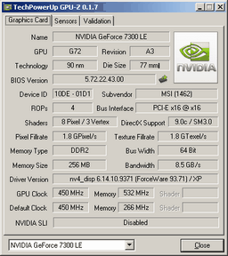 2 ноября 2009 г. GPU-Z - Полная информация по вашей видеокарте. Что тут еще сказать... Есть конечно всякие сандры, эвересты и пр. Но. У меня стоит очень плюшевая, бюджетная noname карточка GeForce 7300. Я точно знаю, что у нее 256 метров памяти (на ней и наклейка производителя даже об этом говорит и цена...). Стандартые средства винды и панель драйвера говорят что 512 метров. Так же говорит Everest, Auslogic system information, Sandra 2007... И только эта целенаправленная утилита говорит что 256. Интерфейс - Русский. Проверено в Скачать Сайт программы - http://www.techpowerup.com/ |