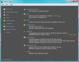 28 ноября 2009 г. Speccy - Отображает информацию по компонентам системы. Программа не слишком дотошная чтобы отображать море второстепенной инфы и не настолько примитивна чтобы отражать то, что мы и сами можем посмотреть через систему. Первая вкладочка общая, глянув на нее сразу понимаем с какой системой имеем дело. На остальных вкладках инфа по разным компонентам, по ним выдается много разной информации, но все по делу. Заострю внимание только на паре вещей. На вкладке CPU видим реальные частоты и температуры всех ядер процессора. На вкладке Graphics видим температуру чипа и количество оперативки, причем мою кривую видеокарточку определяет корректно на 256 Мб, все остальные проги кроме GPU-z считают что там 512 (а это не так). Хороший плюс утилиты, помимо выдачи необходимой инфы в том, что представляет собой единственный exe-файл, работает откуда угодно и такие утилиты как CPU-z и GPU-z становятся невостребованными. А чтобы добавить значимости программе упомяну что производитель компания Piriform, давшая нам такие замечательные продукты как Recuva, CСleaner, Defraggler. Интерфейс Проверено в Скачать Сайт программы |